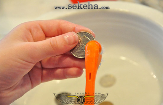سکه های نیکلی در گذر زمان کدر می شوند. آن را درون ظرفی از محلول یک به پنج آمونیاک و آب بگذارید. سکه را با مسواکی نرم بشویید تا جرم آن پاک شود. این روش برای سکه های بانکی توصیه نمی شود. از نگهداشتن سکه در مدت زیاد در این محلول خودداری کنید. پس از تمیز کردن، سکه را با آب خالی بشویید تا محلول از روی سکه برود. سپس سکه را بر روی دستمالی نرم، در مجاورت با هوای خشک قرار دهید تا کاملا خشک شود. حالا سکه را بدون تماس دست در کاور مناسب قرار دهید.