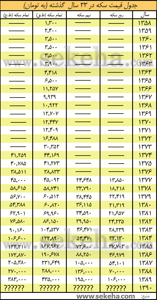 جدولی که در پایین مینگرید نوسانات قیمت سکه در سی و سه سال گذشته ایران میباشد که دیدن آن خالی از لطف نیست.